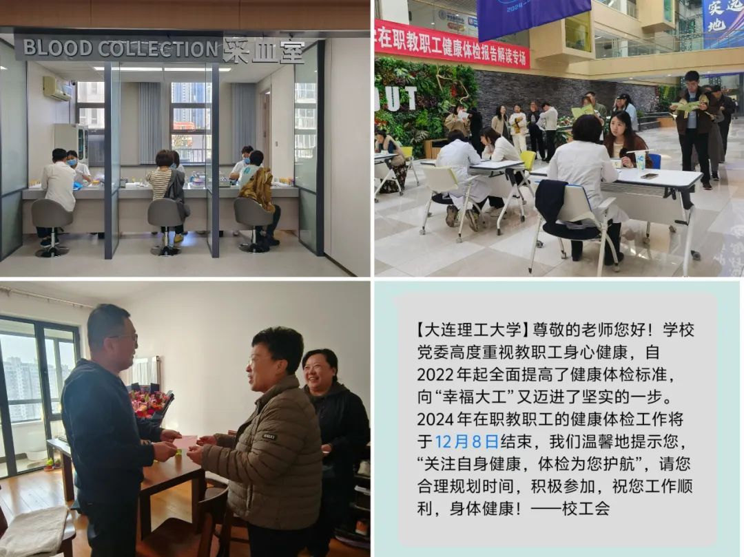 为了给广大教职工提供最全面细致的服务,校工会经协商谈判,在原有的大连医科大学附属第一医院、第二医院、大连理工大学附属中心医院、校医院的基础上新增了大连市友谊医院、大连市第二人民医院(市体检中心)、大连大学附属中山医院三家三甲医院作为教职工定点体检医院,并指派专门工作人员同每家医院进行联系,建立了“月报”制度,随时跟进教职工体检情况。通过这项制度校工会准确预估了2024年的体检进度,在教职工体检集中的9月和10月利用周末时间举办了四次教职工专场体检,近千名教职工参加,深受广大教职工欢迎。