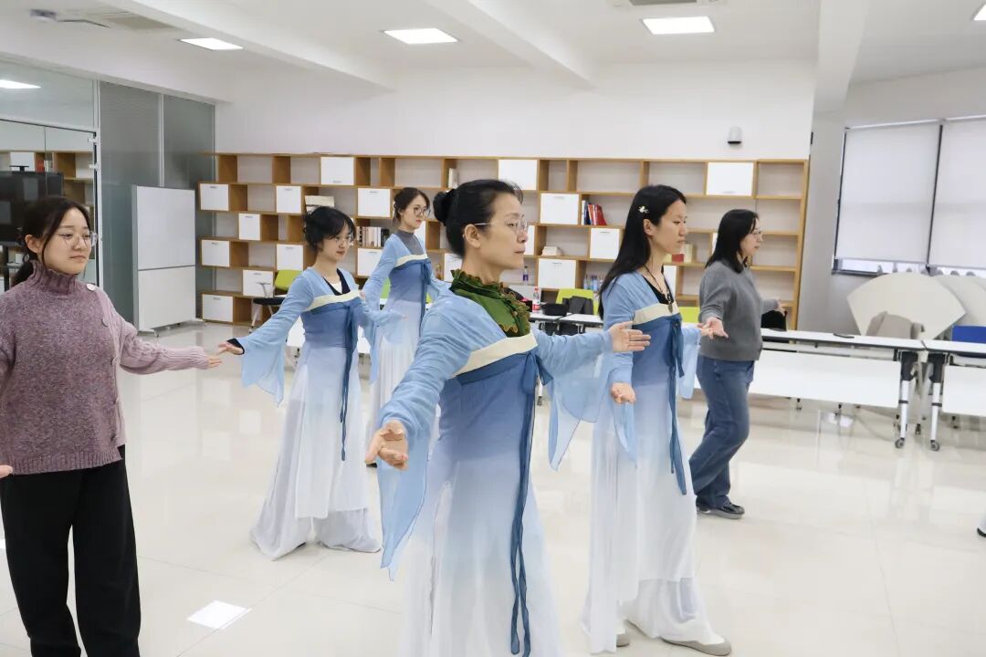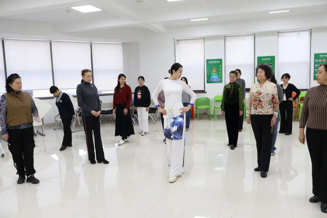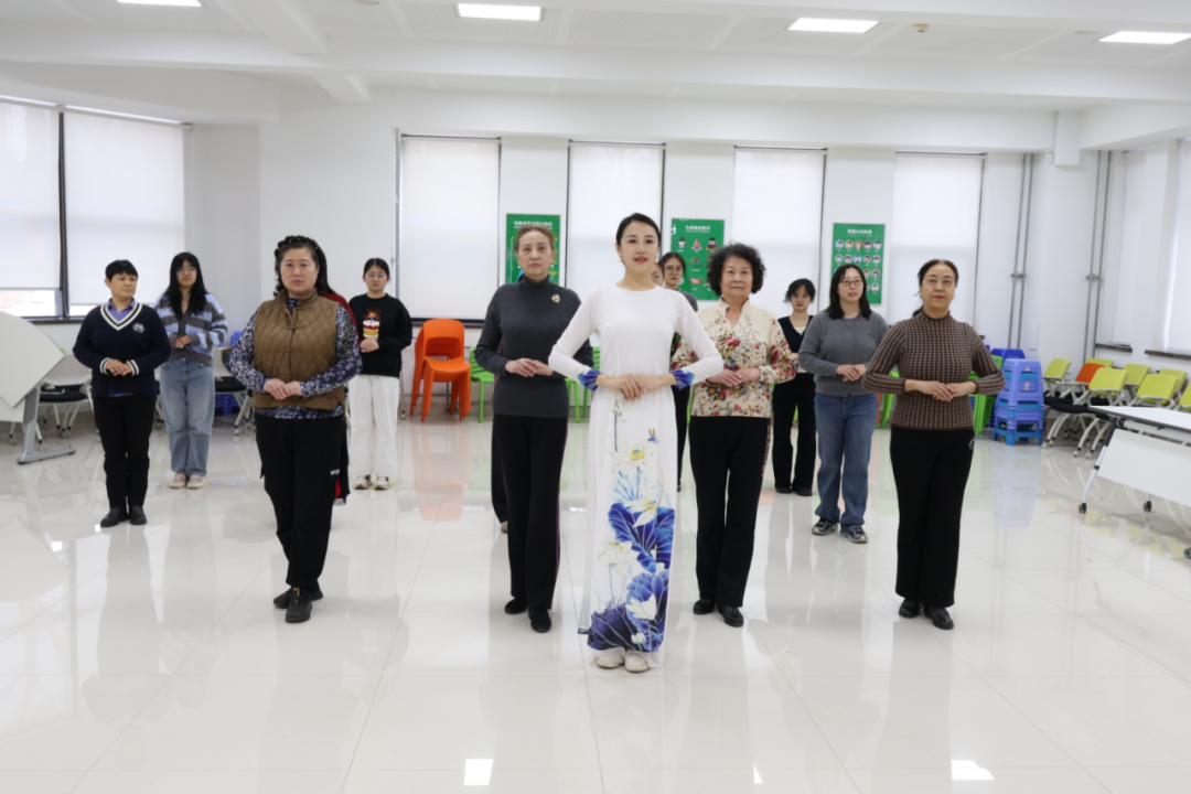女性师生走近现场,在工作人员的指导下身着传统服饰,学习形体礼仪,充分互动交流,感受传统文化的魅力。