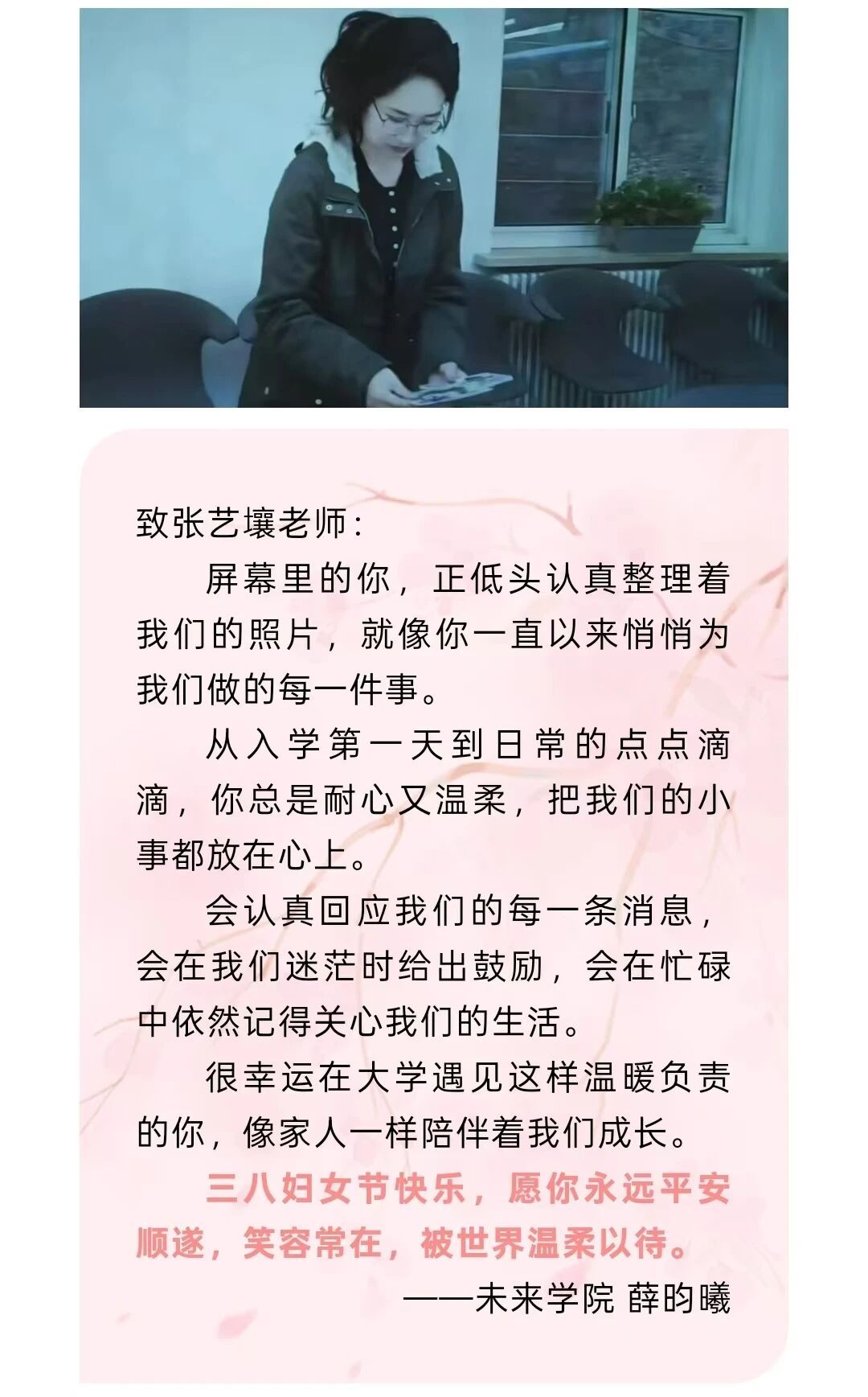 为庆祝第116个“三八”国际劳动妇女节,致敬未来的“她”,未来技术学院、未来书院精心策划了丰富多彩的活动。学院基层工会举办了“花间她语·未来谈”及“她与木,写给未来的信”主题活动,以思想共鸣与美育体验为载体,在花香与木香中为女教师们送上节日祝福;未来书院、未来家则在一舍及学院楼大厅举办"春日花开,书院有信"主题活动,以鲜花与信件传递温暖,让女生们在属于自己的节日里感受被珍视的美好。