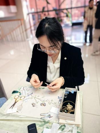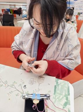 学院邀请了非遗文化讲师史博老师详细讲解非遗宋锦的起源、类别、工艺特点和主要工艺步骤、纹样及应用寓意等基本知识,并讲解了利用非遗宋锦制作配饰的过程、注意事项,带领大家选取自己喜欢的纹样,着手制作专属节日礼。教职工们暂时从紧张的工作中抽身,沉浸式体验,互动交流,领悟传统文化所蕴含的历史智慧和人文精神。
