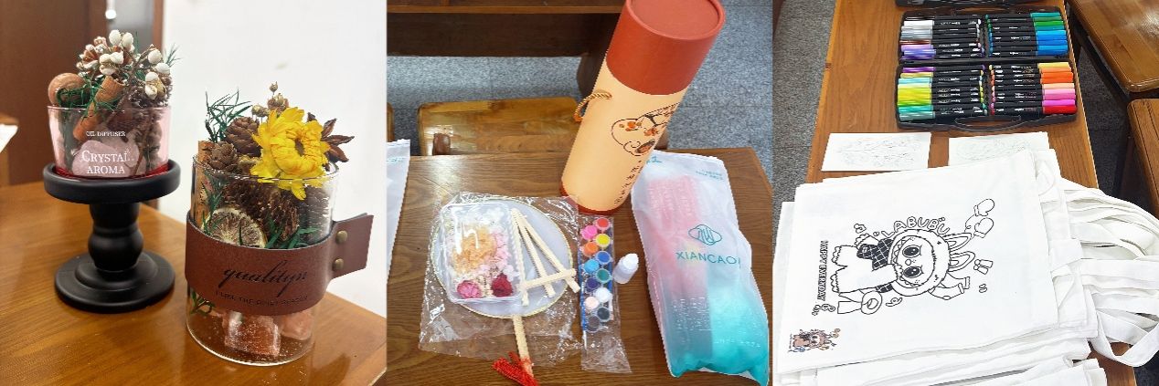 活动现场设置了香薰摆件、艾草养生锤、干花团扇、帆布包绘画四项手作项目。精油香气中,大家将创意融入玻璃杯中,定格专属芬芳;艾草绒在巧手捆扎下变成胖乎乎的养生锤,互相敲打肩颈、舒缓疲惫;素白团扇配上干花,拼贴出诗意画卷;帆布包上,画笔勾勒出个性涂鸦与温暖短句。大家一边创作一边交流,笑语盈盈,其乐融融,在慢时光中感受手作带来的治愈与美好。