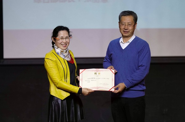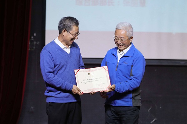 冯振业主席为名誉会长卢中昌教授颁发证书(名誉会长张德祥教授临时有事缺席),老会长为郑玲老师颁发新任会长聘书。