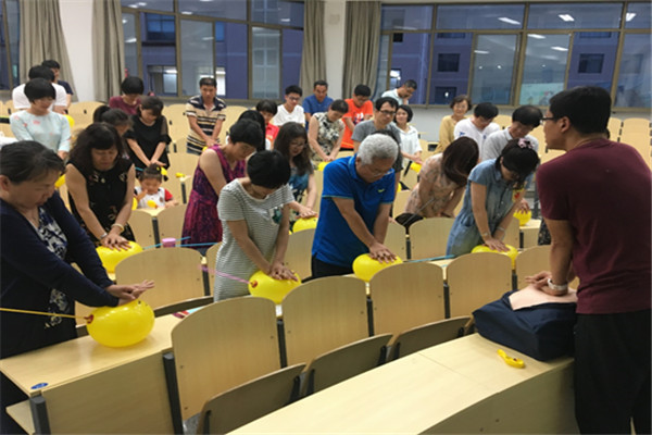 讲座以一段海边游泳意外溺水后,成功被援救的案例的视频拉开主题,配合文字、图片、视频多种方式,将“游泳健身”、“游泳环境与安全”和“水中救生”三个部分的内容做了阐述。游泳健身常识中将游泳者的状态按照游泳运动实施频率和水平分为:能游泳、会游泳、善游泳、练游泳四个级别,帮助各位游泳爱好者认识自己的游泳状态。在讲述游泳环境与安全中,对于泳池、海洋环境中各种影响因素做了阐述,特别是将海洋游泳中地形、海浪、海流、水温、潮汐等对游泳的影响,危险的海洋生物的识别与防范做了详细介绍。在讲到“水中救生”内容时,组织者特意准备了气球和一次性CPR屏障消毒面膜,帮助参加者深切地体会到心肺复苏术的操作过程和身体感受,最大程度地推广了实践过程。最后,有以一段仿真度极高地心肺复苏救援视频为讲座进行了收尾。