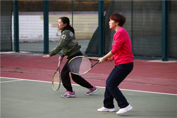 甲乙4个小组分别在4片场地进行。在大风中比赛难度很大,一会顺风一会逆风,控球很不容易,平时能出界的球,现在在大风的阻挡下刚刚到发球线的位置;平时到发球线的球,在风的助推下很容易出界。即使这样,女老师们打得一样专注,玲导不停地提醒大家千万不要受伤,一定要活动开了再开始比赛,角度太大的球就不要救了。可队员只要在场上,脚步就不听自己支配了,有球肯定救。