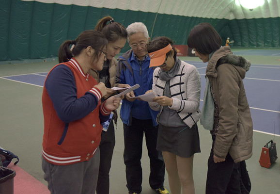 11月27日12:00-19:00点,维多利亚网球馆,16位身着靓丽橙色队服的美女,兴高采烈,过节一般的热闹。女子单打年终总决赛在大家的期盼下如期举行。按照积分赛的成绩排名,16位美女分成了4个组。甲A:李英敏、姜艳红、张丽慧、关佳茹;甲B: 聂琼、徐红、王海燕、王巍;乙A: 戴忠玲、王林、李宏伟、王静;乙B: 张建红、徐强、林源、刘艳。每个小组内循环,甲组一盘6局无占先,5:5平分抢七;乙组一盘4局无占先,4:4平分抢七。小组前两名出线,交叉淘汰阶段,甲乙组都是一盘6局。