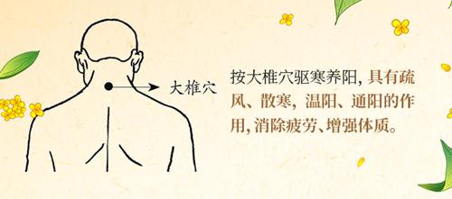 按大椎穴驱寒养阳。大椎穴位于后正中线上,第7颈椎棘突下凹陷中。经常刺激大椎穴,具有疏风、散寒,温阳、通阳的作用,可以消除疲劳、增强体质,对于感冒防治都有较好效果。(本文由北京中医药大学东直门医院男科主任王彬、医生毛鹏鸣进行科学性把关)