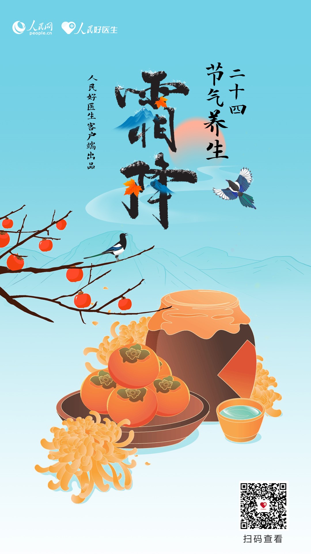霜降,含有天气渐冷、初霜出现的意思,是秋季的最后一个节气,预示着天气进一步变冷,早晚气温变化增大。而人体亦会顺应天地阴阳二气的变化,阳气逐渐收敛潜藏,以顺应秋收之性,为冬天的潜藏做好准备。