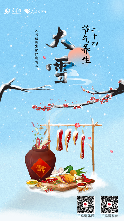 大雪是农历二十四节气中的第21个节气,冬季的第三个节气,标志着仲冬时节正式开始。《月令七十二候集解》说:“大雪,十一月节,至此而雪盛也。”天气愈发寒冷,人体阳气内藏,中焦脾阳充足,此时“进补”能够使营养物质转化的能量最大限度地储存于体内,有助于来年体内阳气的生发。但人的体质有寒热虚实之分,食物也有寒热温凉四性,如何根据个人体质辨识进补之法?大雪节气养生有什么注意事项?人民好医生《个人健康手册(二十四节气·大雪篇)》为您进行解答。